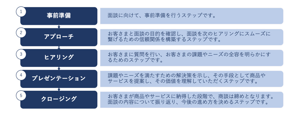 法人営業のプロセスは、大きく5つのステップから成ります。5つのステップの各タスクを着実にこなしていけば、法人向けの営業スキルは確実に向上していきます。