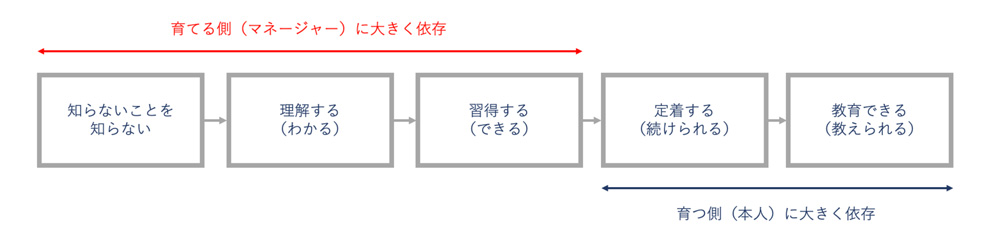 人材育成の概念についてもご紹介します。新しいスキルを習得する際、人は「知らないことを知らない」状態からスタートすることを覚えておきましょう。スキルを取得するまでは、育てる側(マネージャー)に大きく依存します。また、取得したスキルを定着させ、人に教えられるようになれるかは、育つ側(本人)に大きく依存します。