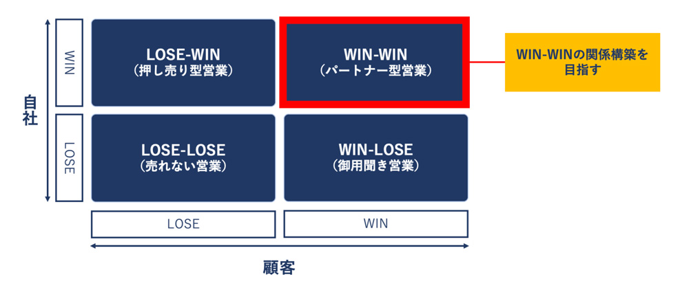 仮に受注に繋がったとしても、押し売り型(LOSE-WIN)や、御用聞き型(WIN-LOSE)では、お客さまとの長期的な関係は構築できません。