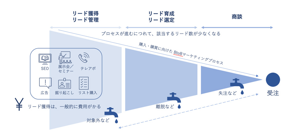 特にプロセスからの漏れ(離脱)については漏れが少ない状態になるように改善していきましょう。漏れが少ない状態であればリード獲得に資金を投下しても回収できるようになります。まずは、投下資金を回収できる仕組みを整備していきましょう。
