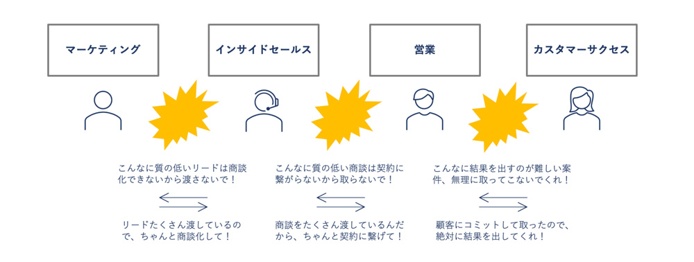 BtoBマーケティングのプロセスの細分化は専門性と生産性を高めますが、一方で部門間のコミュニケーションに軋轢が生まれてしまうといった別の問題を引き起こしがちです。