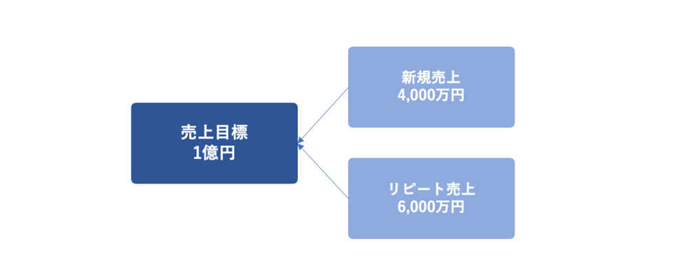 上記の図のように、売上目標は1億円、リピート売上は6,000万円、平均受注単価は200万円とします。また商談数に対する受注数は20%、リード数に対する商談数は10%とします。この場合、売上目標1億円を達成するためには新規売上を4,000万円上げる必要があります。