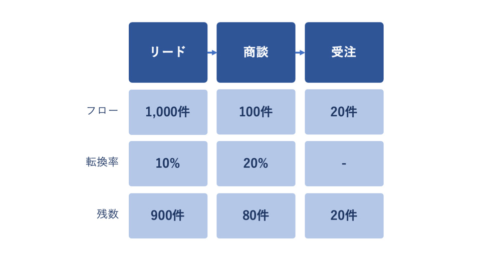 プロセスが整備されていない最初のフェーズでは、全体の数字を大まかに把握するところからはじめます。下記の図のような粒度でも、1,000件のリードを追加で獲得できれば、受注が20件増えることがわかります。