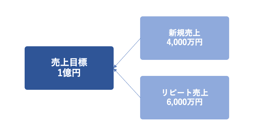 該当年度内(一年以内)に売上目標1億円を達成するためには、リピート売上として見込める6,000万円以外にも、新規売上が4,000万円必要になります。そのため、KSFは「新規売上4,000万円を達成すること」になります。