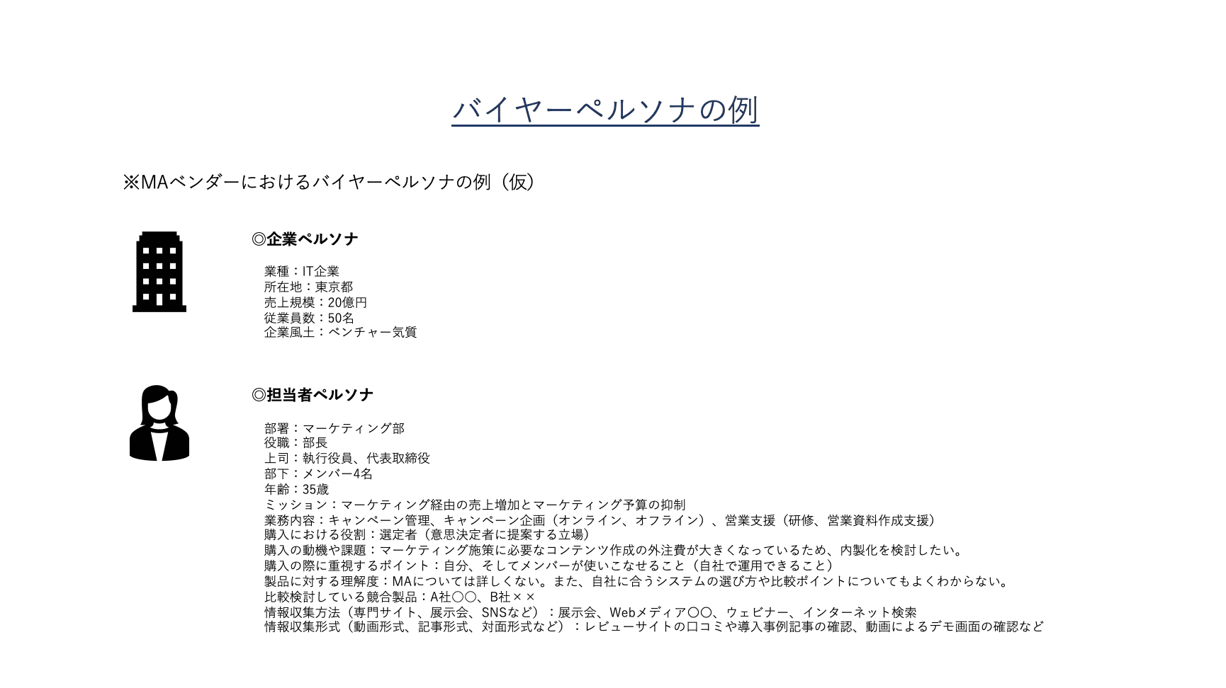 バイヤーペルソナが、前述したように企業間取引(BtoB)においてアプローチ対象となる見込み客像のことを指します。
