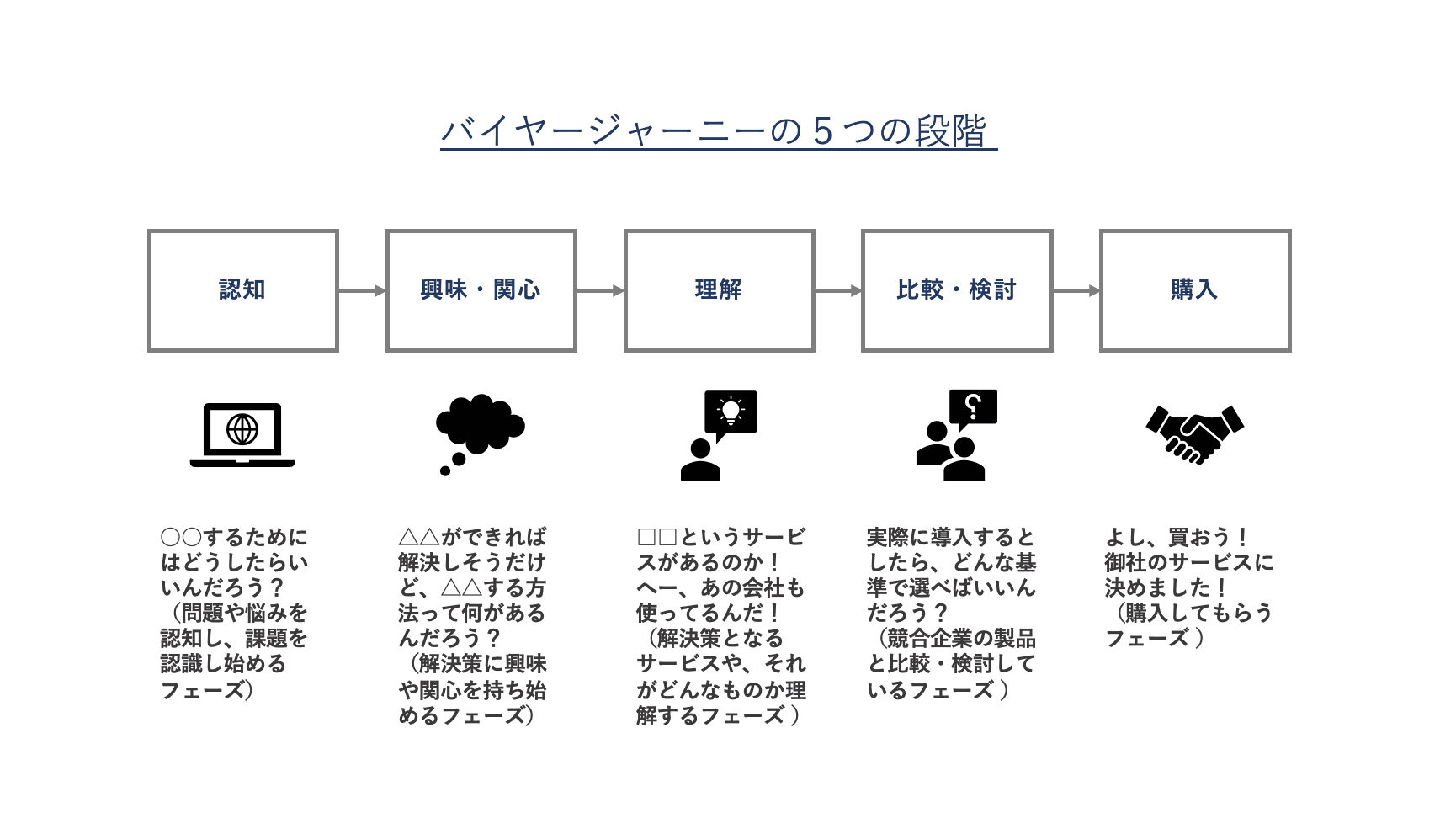 バイヤージャーニーの各フェーズは、以下の5つの段階に分かれています。