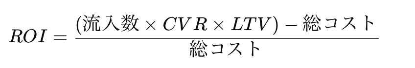 つまり「流入数 × CVR × LTV」で得られる売上から、総コストを引いた利益をコストで割ることで、投資1円あたりのリターンを数値化できます。