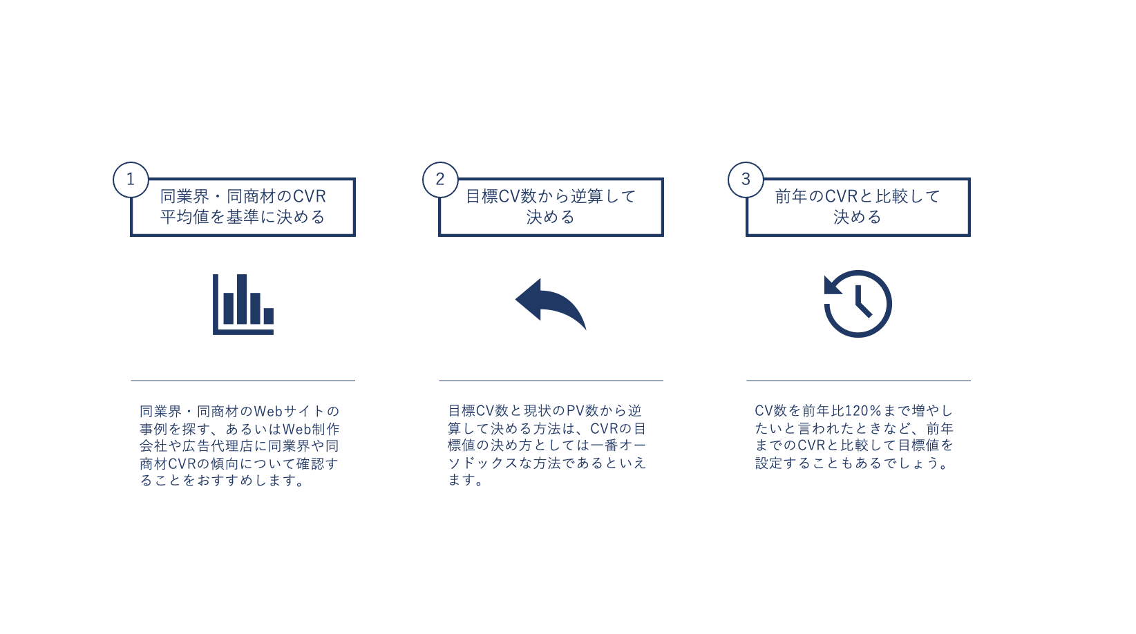 そのため、CVRの目標値の決め方にも唯一の正解はないのですが、本記事では代表的な決め方を3つご紹介します。