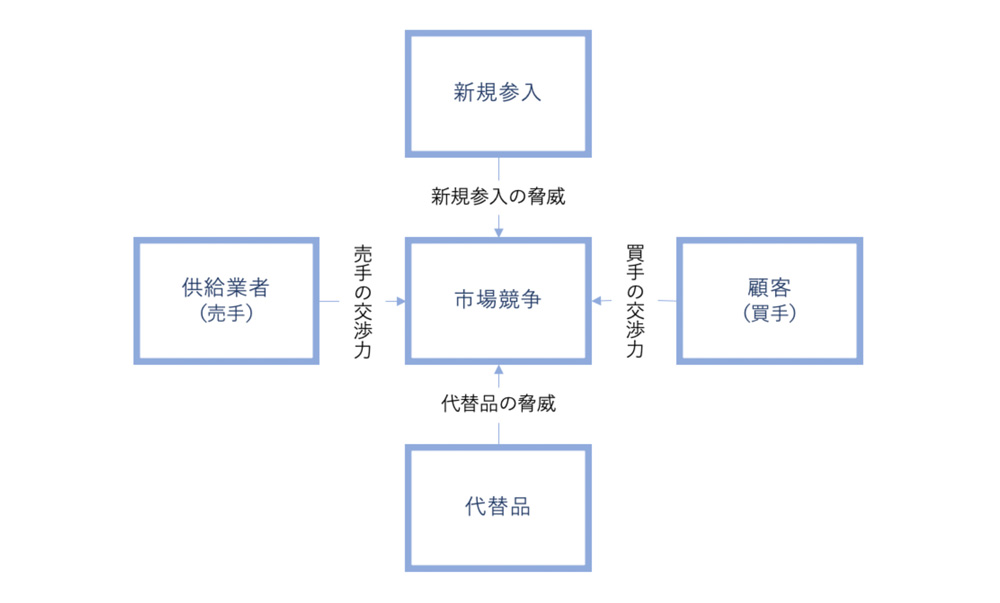 市場競争(業界内の競争)とは、業界内の競合他社との競争の激しさのことを指しています。競合が多ければ多いほど、市場から享受できる収益を奪い合わなければならず、利益をあげることが難しい業界だと言えます。