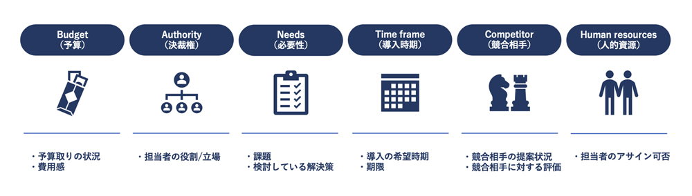 BANT条件とは、Budget(予算)、Authority(決裁フロー)、Needs(ニーズ)、Timeframe(導入時期)の頭文字を示しています。そこにCH、Competitor(競合相手)、Human resources(人的資源)をプラスして、BANT-CH条件と呼ばれることもあります。
