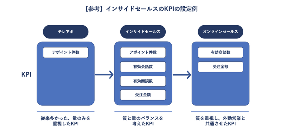 インサイドセールスがフィールドセールスと同様の動きをする場合にはオンラインセールスと言われることもありますが、この場合、有効商談数や受注金額、といった質の部分のみをKPIに置くことが多くなります。