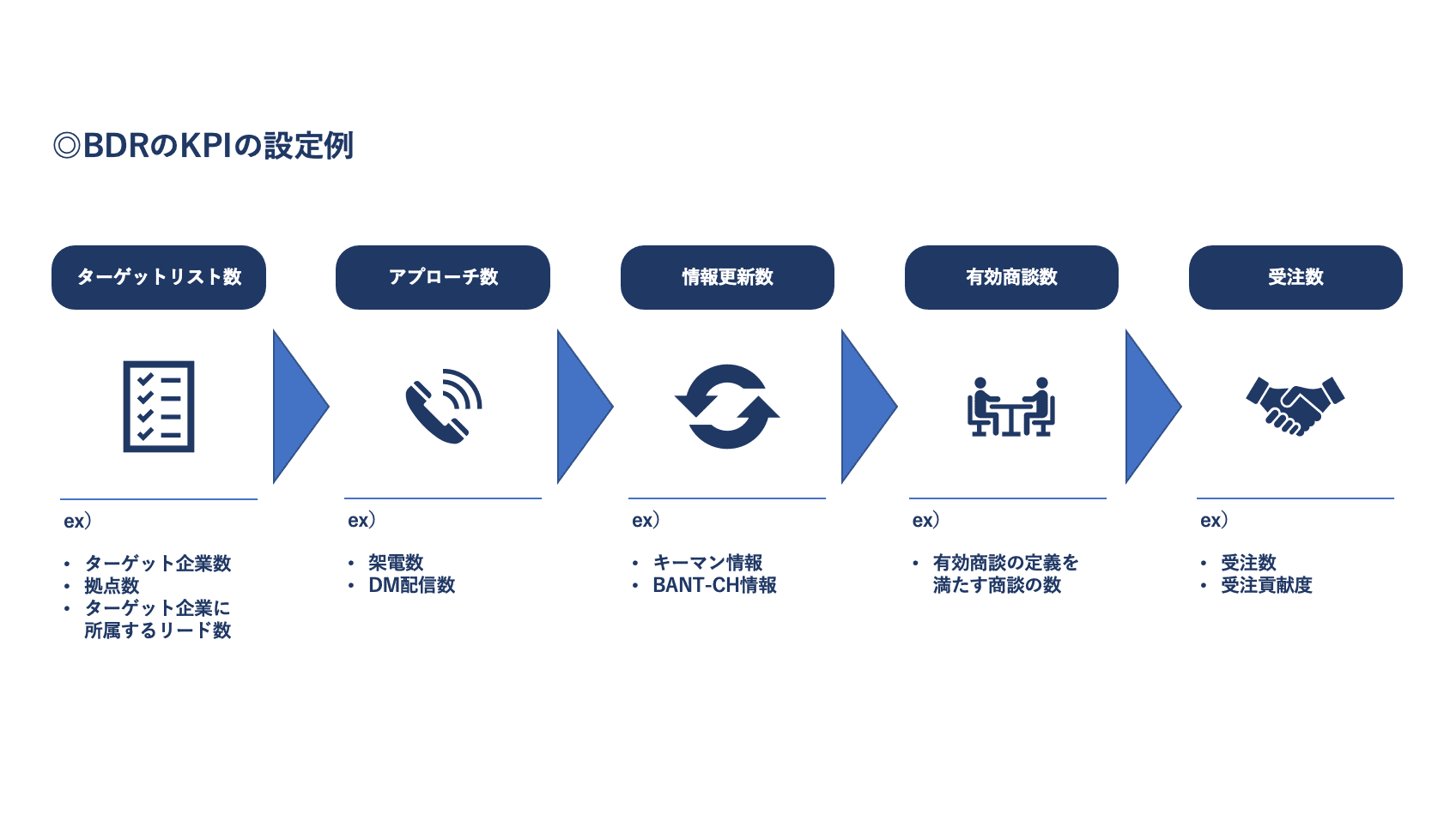 BDRのKPIについては、前述したとおり、BDRに求められる業務範囲次第で変わる可能性がある部分ですが、