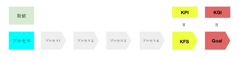 KPIとKGI、KFSの関係を図で説明すると以下のように説明できます。KPIとKGIは数値で表すことのできる概念で、KFSはプロセスを表す概念だということが理解できると思います。