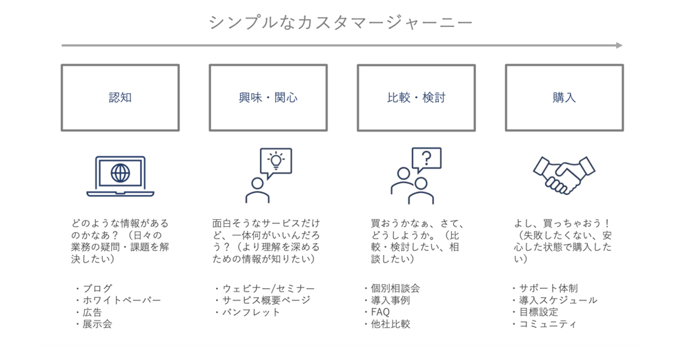 カスタマージャーニーが作成されていない場合、シンプルで構わないので作成するようにしましょう。また、購買プロセスの各段階においてどのような情報ニーズが発生するのか整理しておきましょう。