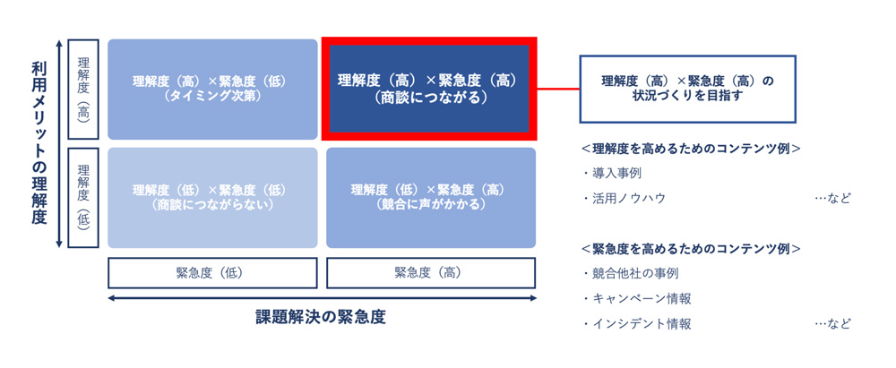 利用メリットの理解度を高めるためのコンテンツ例としては、導入事例や活用ノウハウなどがあげられます。また、課題解決の緊急度を高めるためのコンテンツ例としては、競合他社の事例やインシデント情報、キャンペーン情報などがあげられます。