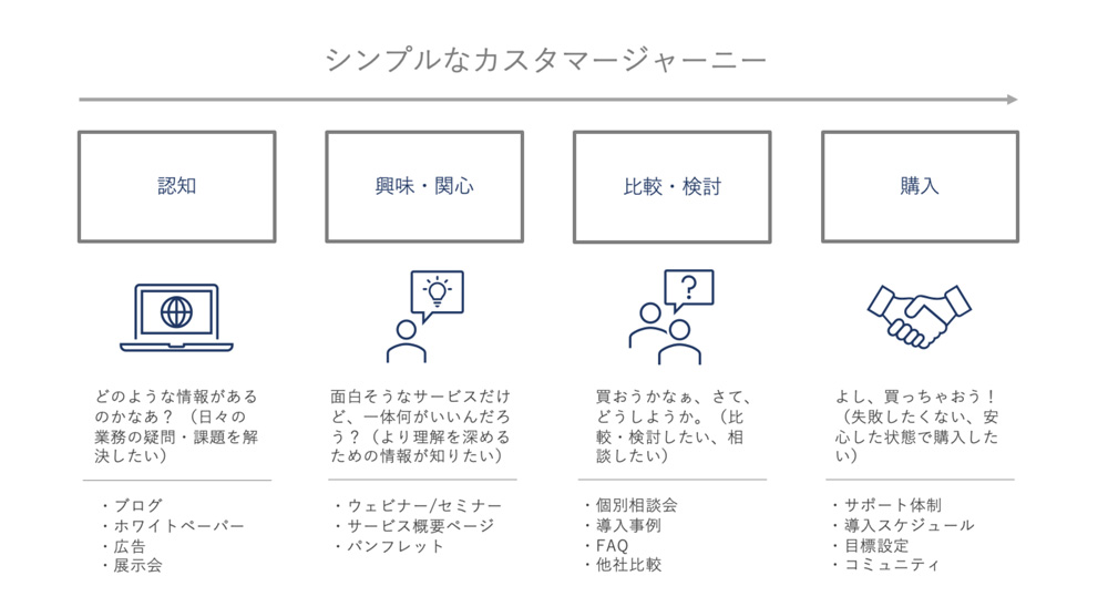 例えば、上記のカスタマージャーニーの図を例に取れば、個別相談会への参加や、導入事例の閲覧などの条件を満たしている見込み客は「比較・検討」のステージにいる、といった具合です。
