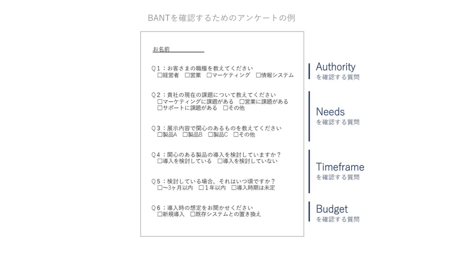 アンケート用紙やアンケートフォームを作成する際には、前述したBANT条件(BANT-CH条件)が項目から確認できるように設計することをお勧めします。