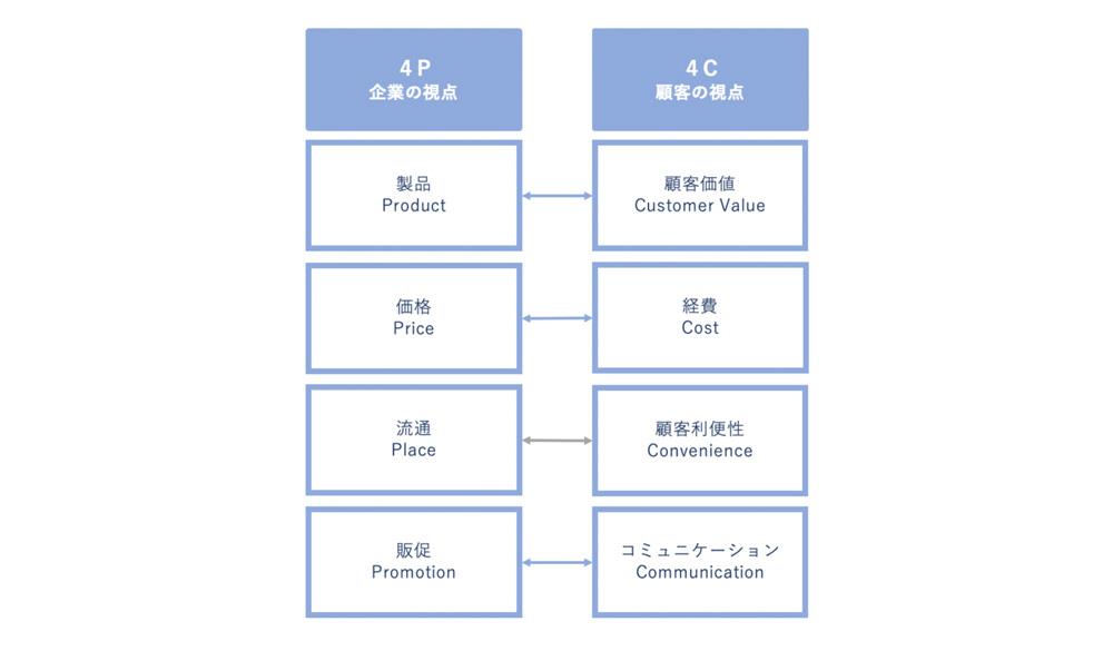 4つの要素は、企業からの視点では、製品(product)、価格(price)、流通(place)、販促(promotion)と整理することができ、それぞれの頭文字から、4Pと呼ばれています。また、同様の要素を顧客の視点から、顧客価値(Customer Value)、経費(Cost)、顧客利便性(Convenience)、コミュニケーション(Communication)と置き換えて表現することもあります。この場合、4Cと呼ばれます。