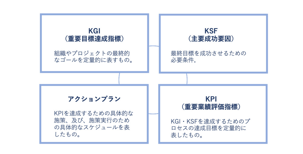評価(C)を行うためには、主要成功要因(KSF)、重要目標達成指標(KGI)、重要業績評価指標(KPI)、アクションプランの進捗率の4つの指標から評価を行うようにしましょう。