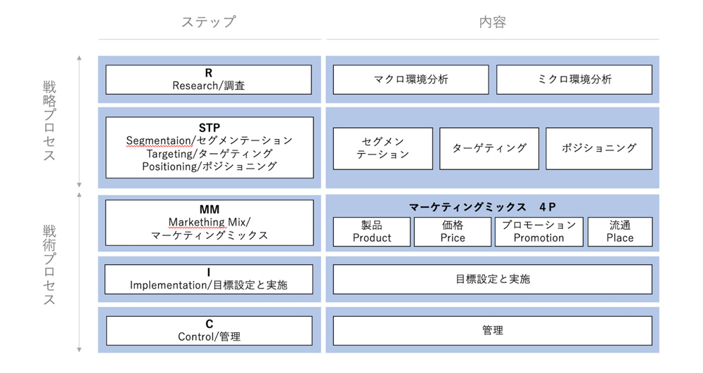 マーケティングプロセスは、マーケティングの戦略プロセス、戦術プロセスの一連の流れを表したフレームワークです。マーケティングプロセスは、5つの基本手順の頭文字をから「R–STP–MM-I-C」と呼ばれることもあります。