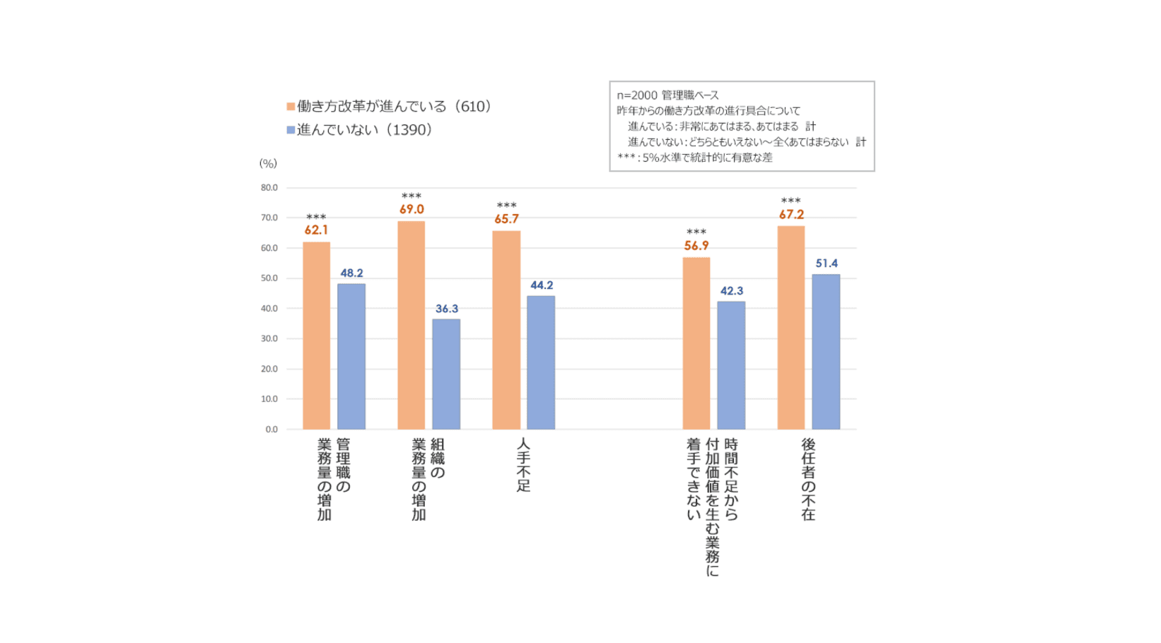 働き方改革が進んでいる企業の方が、進んでいない企業と比べて管理職の業務量が増えている、という皮肉な結果も出ています。