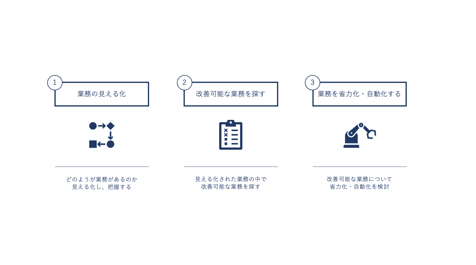 一つ目のステップは、業務の見える化です。どのような業務があるのかを洗い出して見える化し、把握することが大切です。