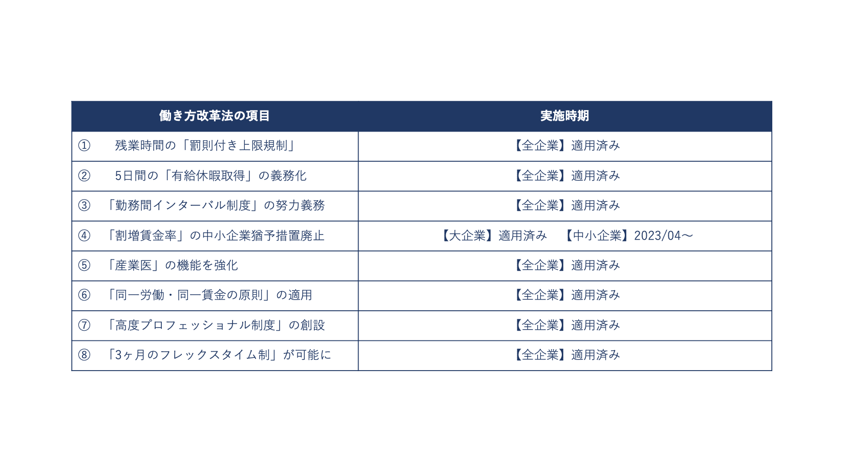 働き方改革関連法(働き方改革を推進するための関係法律の整備に関する法律)とは、2018年に公布された8本の労働法の改正を行うための法律です。働き方改革法による8つの法改正事項と、各項目の適用開始時期については以下のとおりです。既に、多くの法改正事項が適用され始めています。