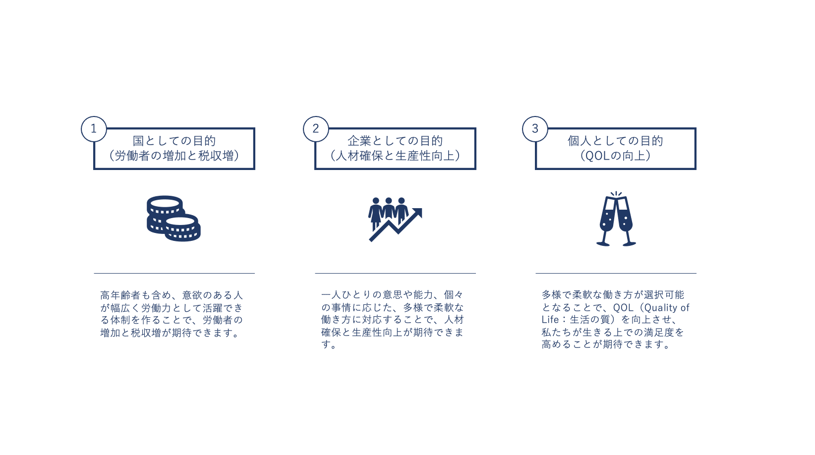 多様で柔軟な働き方が選択可能となることで、QOL(Quality of Life:生活の質)を向上させ、私たちが生きる上での満足度を高めることが期待できます。