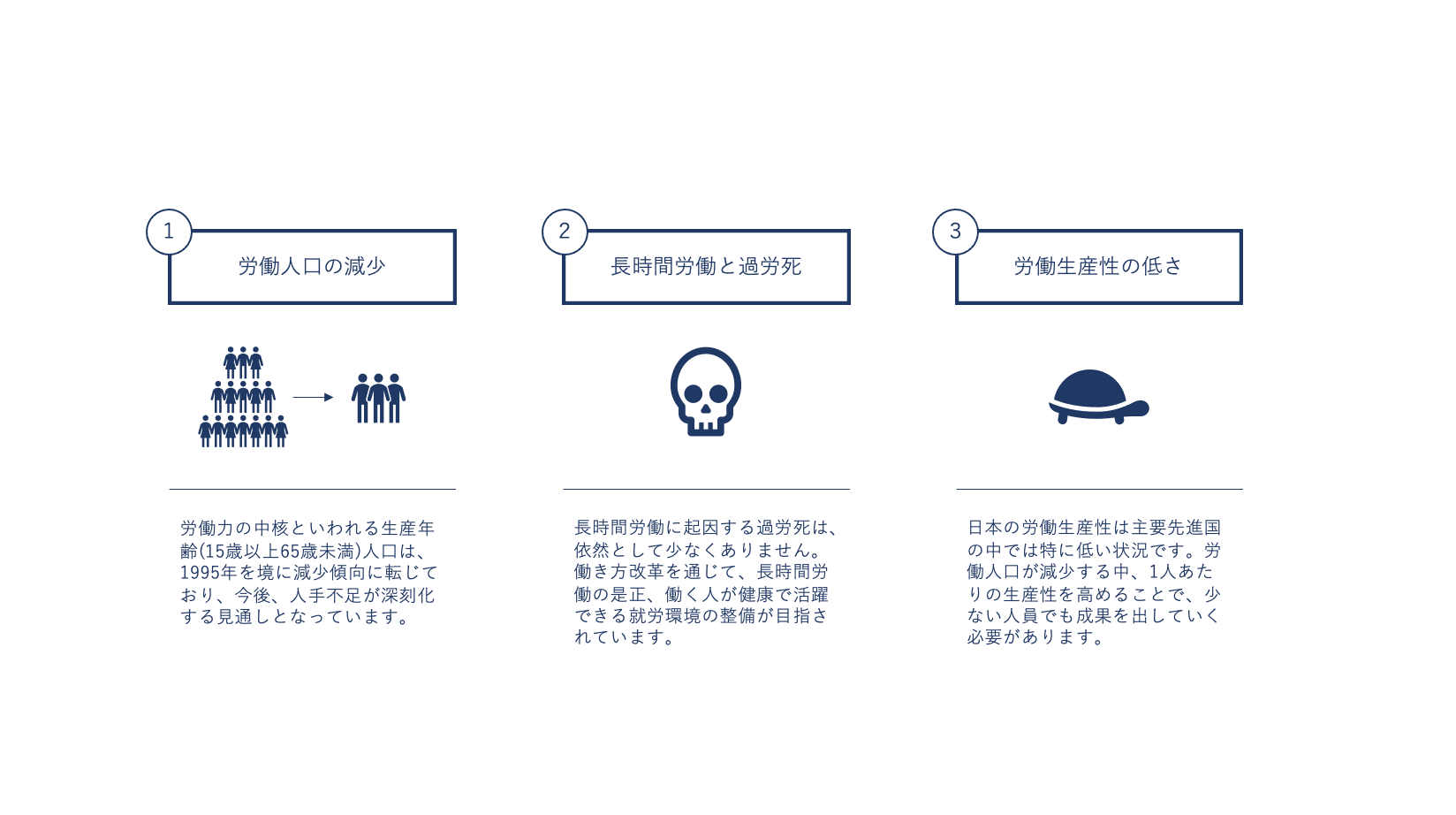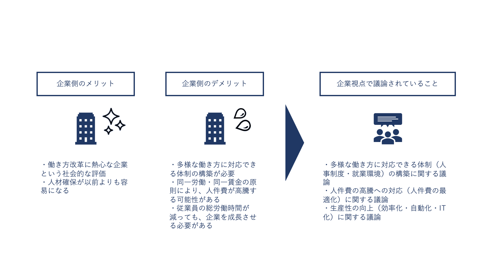 働き方改革の実情について、3つの視点で紹介します。