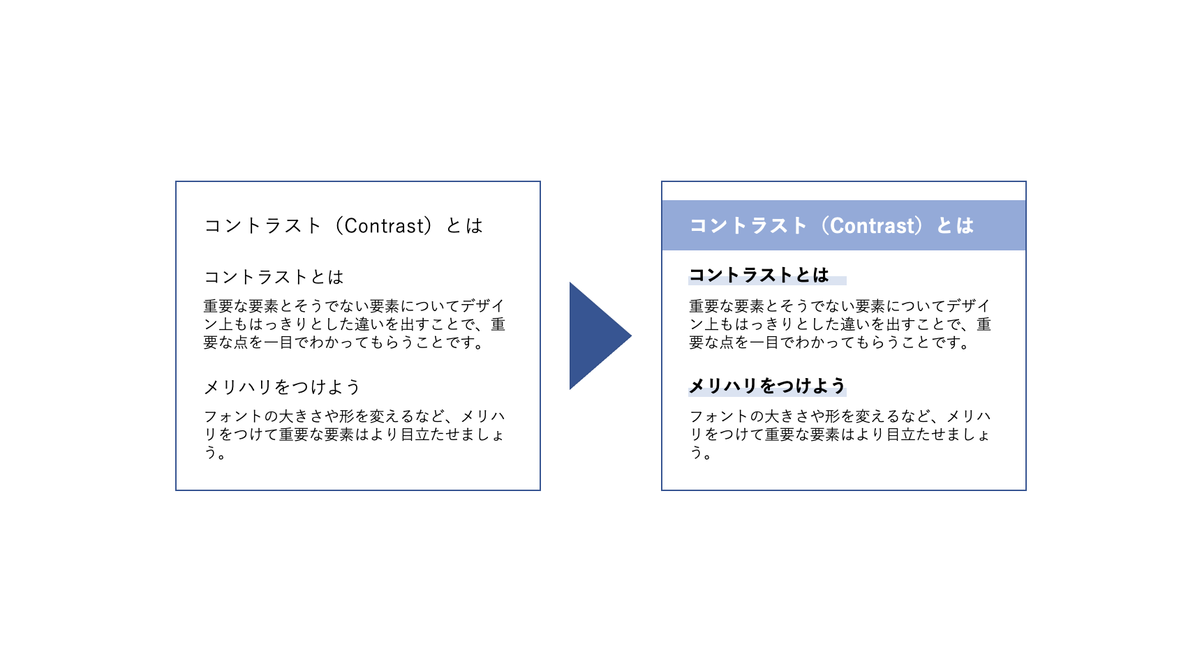 コントラストとは、重要な要素とそうでない要素についてデザイン上もはっきりとした違いを出すことで、重要な点を一目でわかってもらうことです。メリハリをつけて重要な点を訴求するためのデザインだといえます。