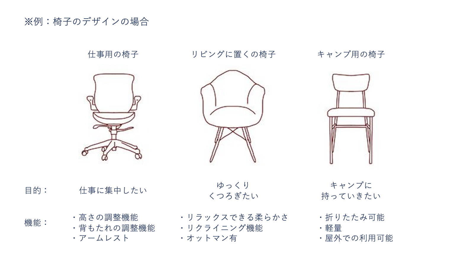 例えば、椅子のデザインで考えてみます。椅子という同じカテゴリにあったとしても「仕事用の椅子」と「リビングに置く椅子」と「キャンプ用の椅子」では、購入の目的も、目的を達成するために必要な機能も違います。