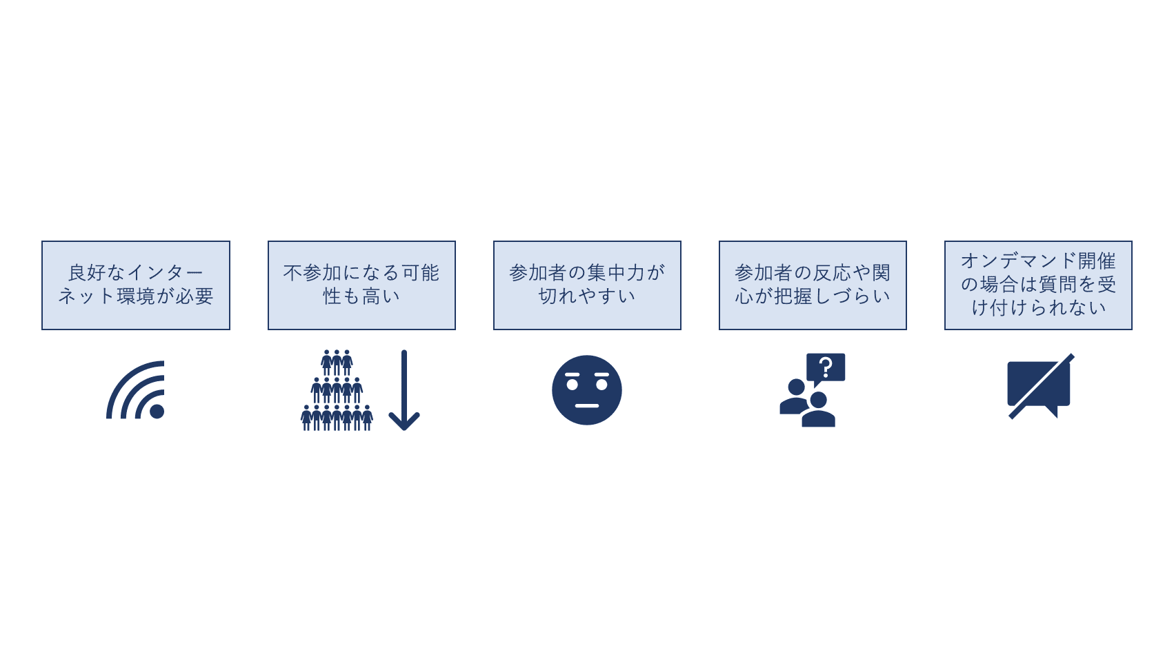 ウェビナーには、ウェビナーならではのデメリットも存在します。以下のようなデメリットも把握したうえで、適切にウェビナーを導⼊することを推奨します。