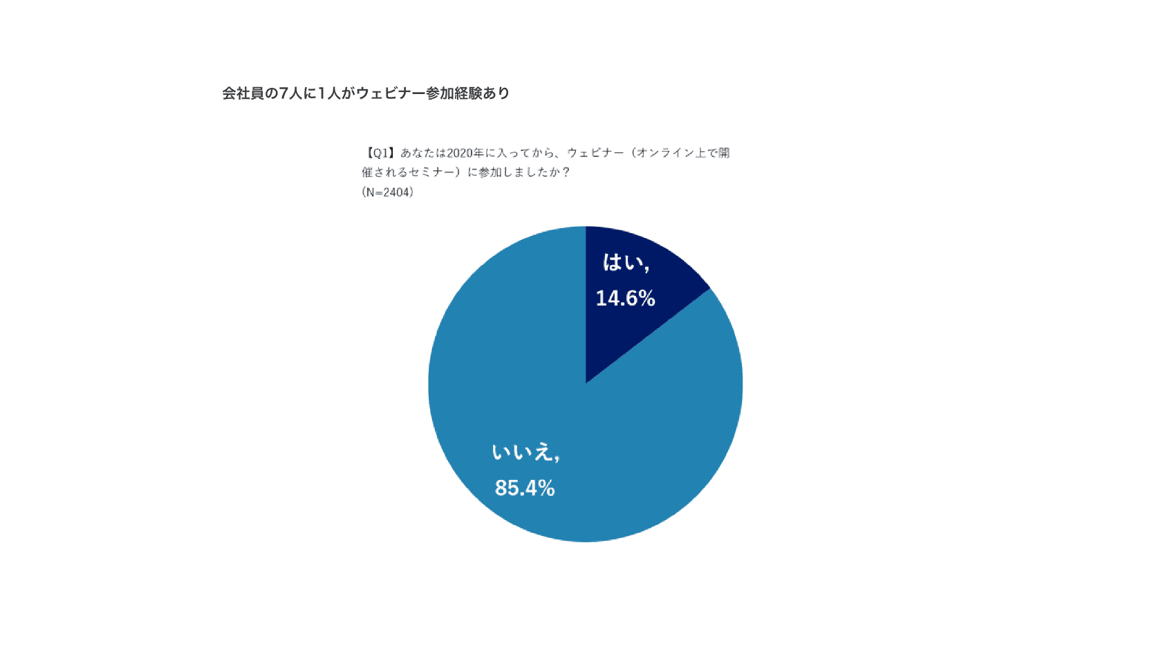 ファストマーケティング社の調査によると、会社員の7人に1人に当たる14.6%の人がウェビナーへの参加経験があると答えています。