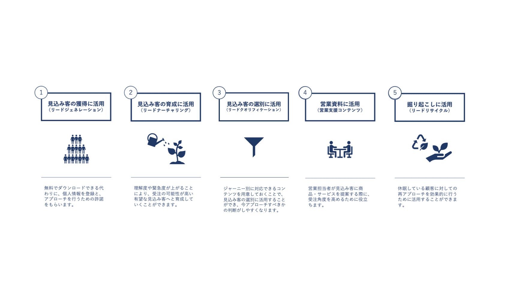 BtoBマーケティングで作成されるホワイトペーパーには、大きく5つの活用方法があります。